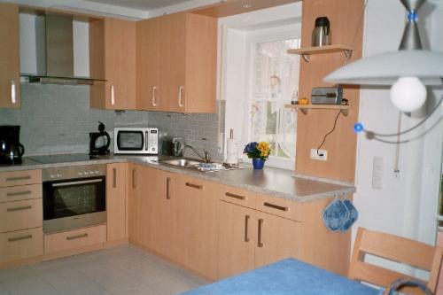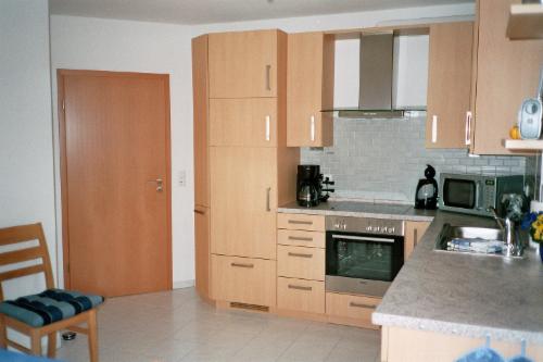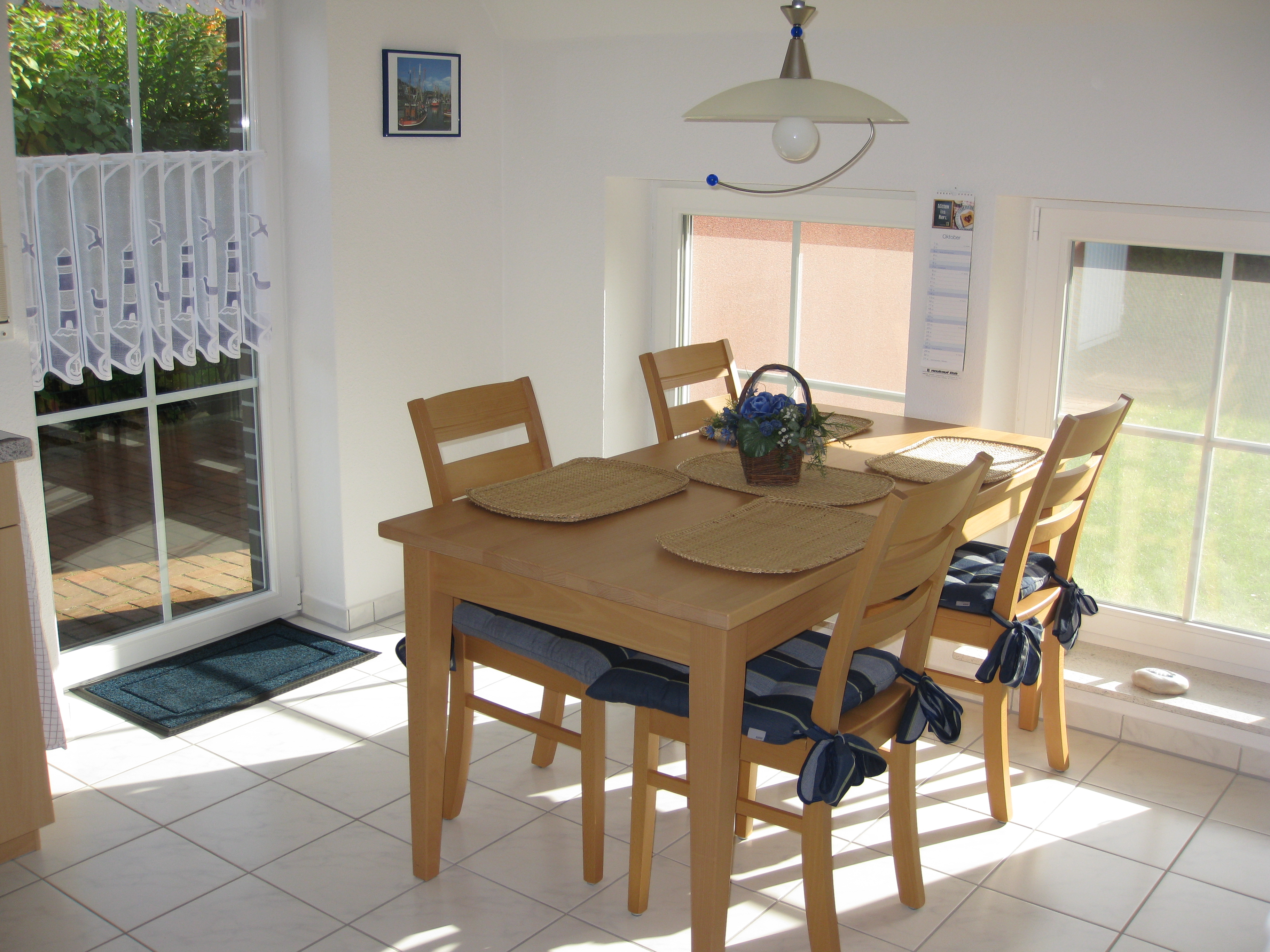 Die in einem separaten Raum befindliche Küche ist komplett eingerichtet, incl. Cerankochfeld mit Dunstabzug, Heißluftbackofen, Geschirrspülmaschine, Kühl- und Gefrierschrank, Microwelle, Kaffeemaschine, Espressomaschine, Heißwasserkocher, Eierkocher, Toaster, Brotschneidemaschine, Handmixer usw. Selbstverständlich finden Sie auch ausreichend Geschirr und Besteck, Töpfe, Auflaufformen, Bräter, Kuchenformen und sämtliche "Küchenutensilien". Auch in diesem Raum befindet sich ein Tisch mit Stühlen aus massivem Buchenholz, sowie ein Radio, damit Sie beim Frühstück den Tag mit schöner Musik und den neuesten Nachrichten beginnen können.